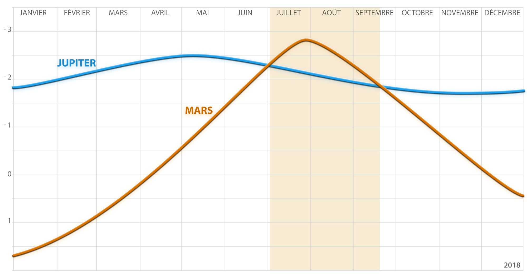 Le schéma ci-contre montre l’éclat comparé de Jupiter et de Mars au cours de l’année 2018. Les mois de juillet et d’août seront donc exceptionnels pour l’observation de la planète rouge !