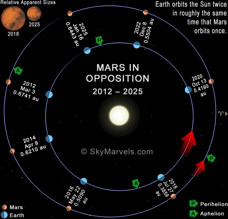 Nous ne serons plus qu’à 57,6 millions de kilomètres de distance à la fin juillet lors de l’opposition martienne, c’est-à-dire lorsque le Soleil, la Terre et Mars seront alignés. Ce rapprochement, le plus serré depuis août 2003, va permettre à l’éclat martien de surpasser celui de Jupiter durant pratiquement tout l’été.