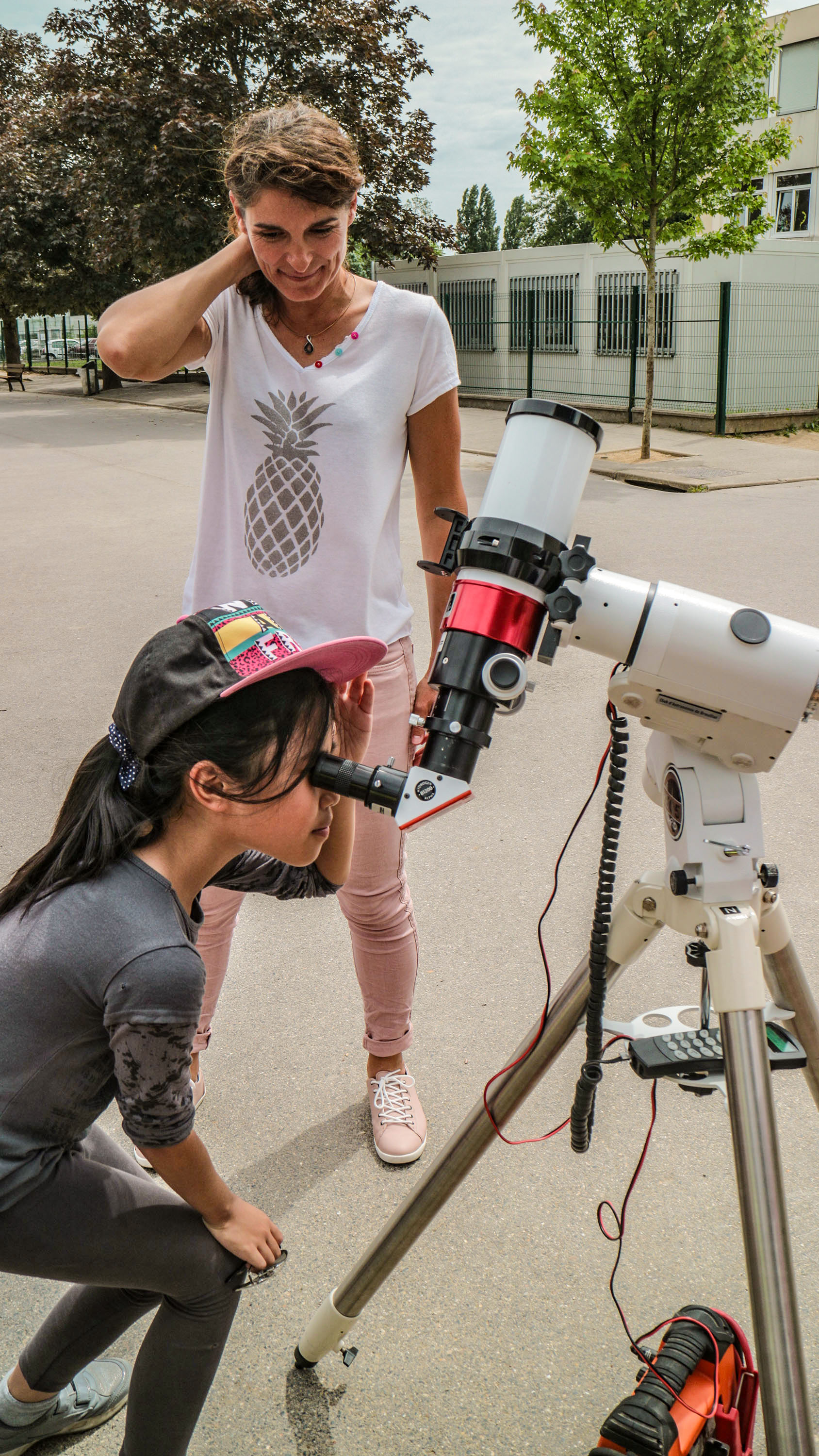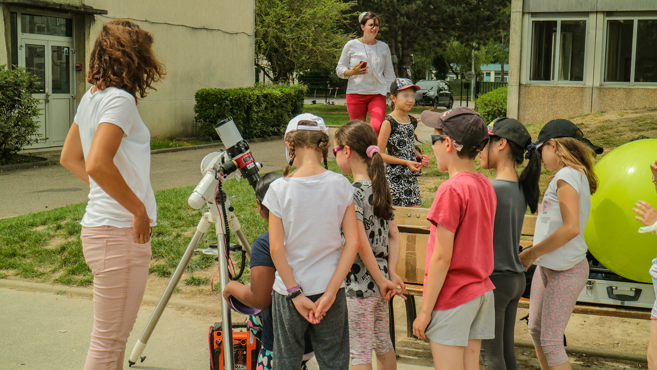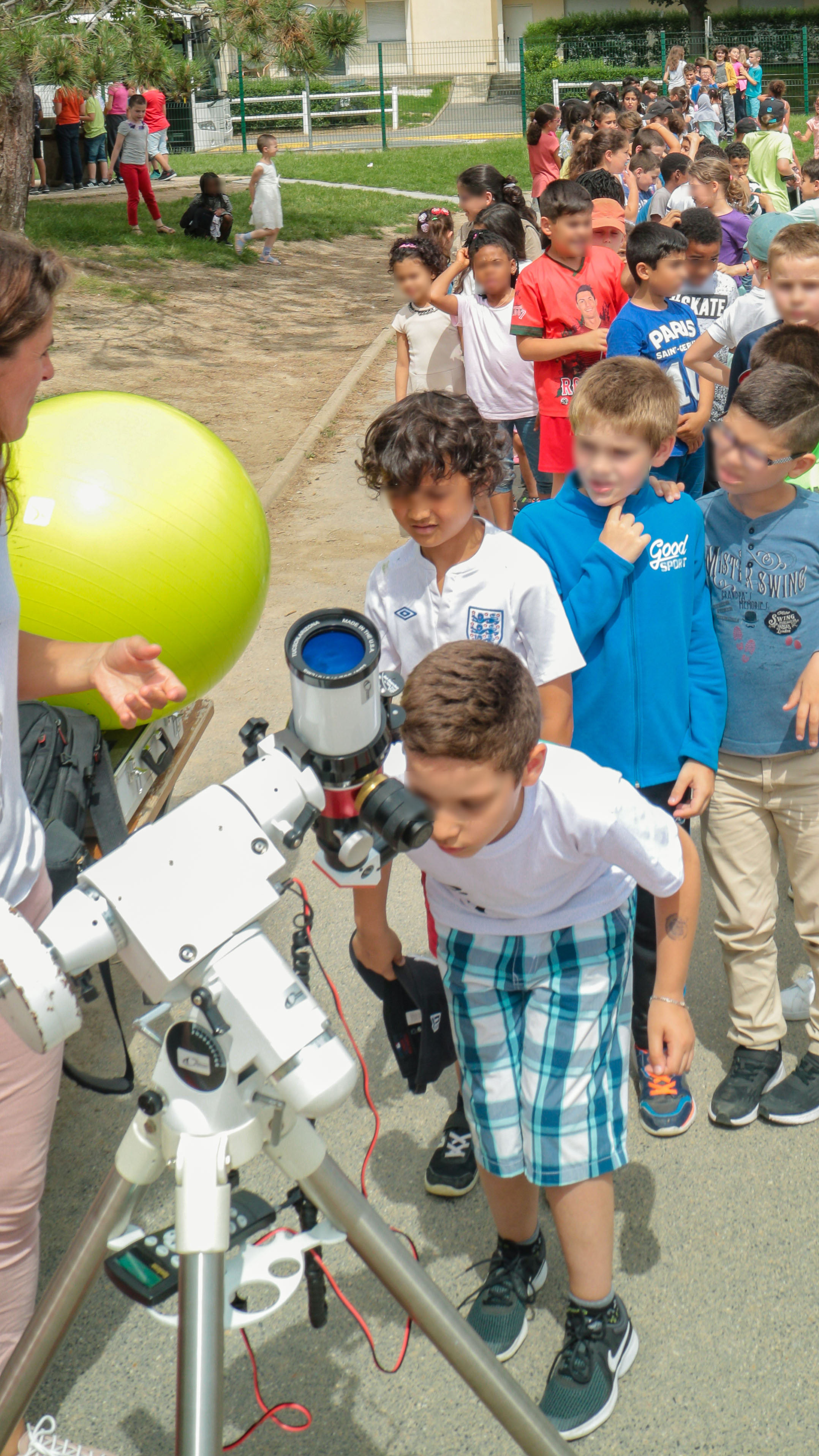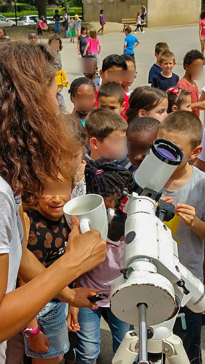 À tour de rôle, les deux classes ont eu droit à la présentation du Système Solaire, et quand le Soleil ne faisait pas trop le timide, les enfants ont pu jeter un œil sur le “disque orange” (mais est-ce bien sa vraie couleur ?) et personne n’aurait laissé son tour pour le voir !
