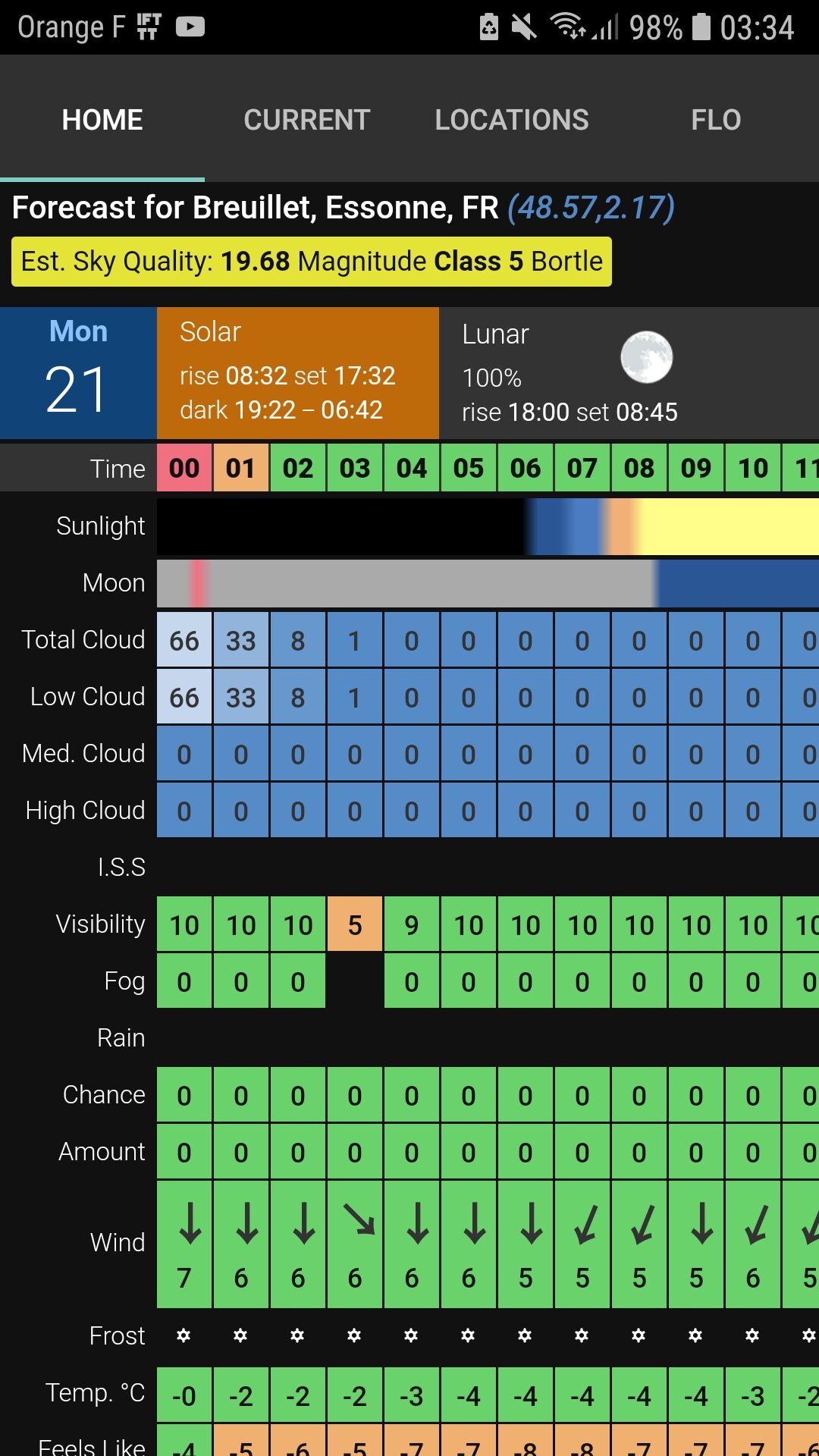 J’ai mis le réveil pour 3h30 dans la nuit de dimanche à lundi pour une nouvelle nuit courte. Bonne surprise au réveil puisqu’en ouvrant les volets j’ai pu constater que la météo disait vrai : ciel dégagé pour observer la Lune.