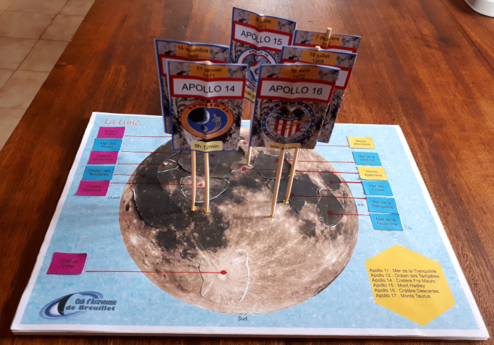 Le 28 février dernier, aux ateliers d’initiation, nous avons construit une jolie maquette de la Lune. Avec un puzzle à compléter pour bien se souvenir de la position de ces quelques mers célèbres : mer de la Tranquilité, mer de la Sérénité, Océan des Tempêtes…