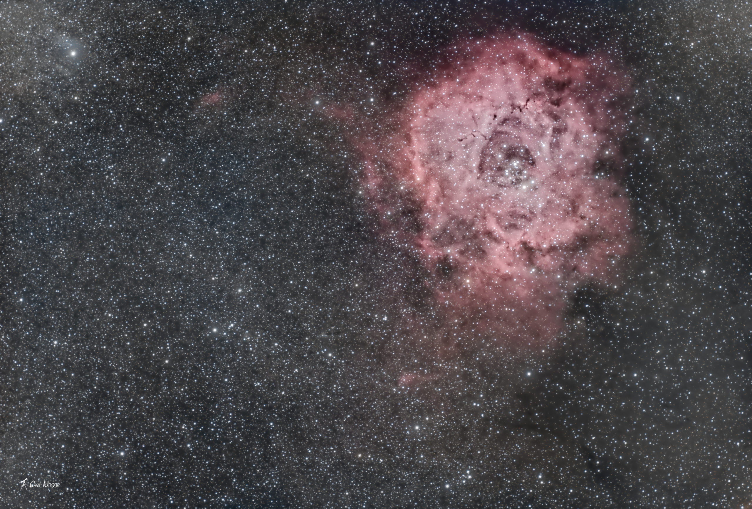 Nébuleuse de la Rosette (NGC 2244) immortalisée avec 360 images de 30s chacune (soit 3 h de temps de pose au total) alors que la météo nous a offert un trou de quelques heures entre les perturbations…