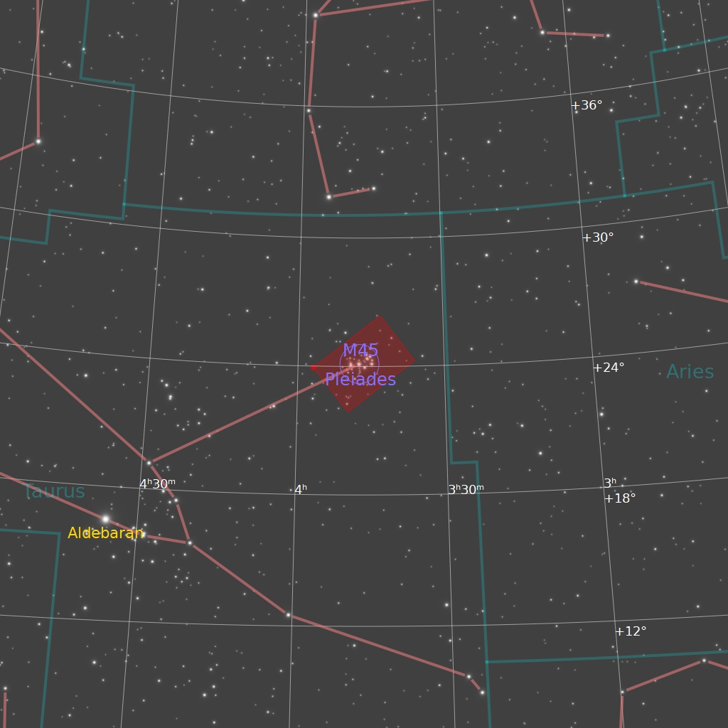 Amas des Pléiades (M45) dans la constellation du Taureau, situé à peu près à 430 années lumière de nous.