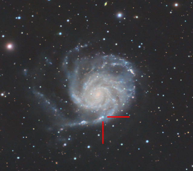Modeste immortalisation de la Super Nova (SN2023ixf) qui a explosé le 19 mai dernier dans la Galaxie du Moulinet (M101) à 21 millions d’années lumière de nous dans la Constellation de la Grande Ourse.