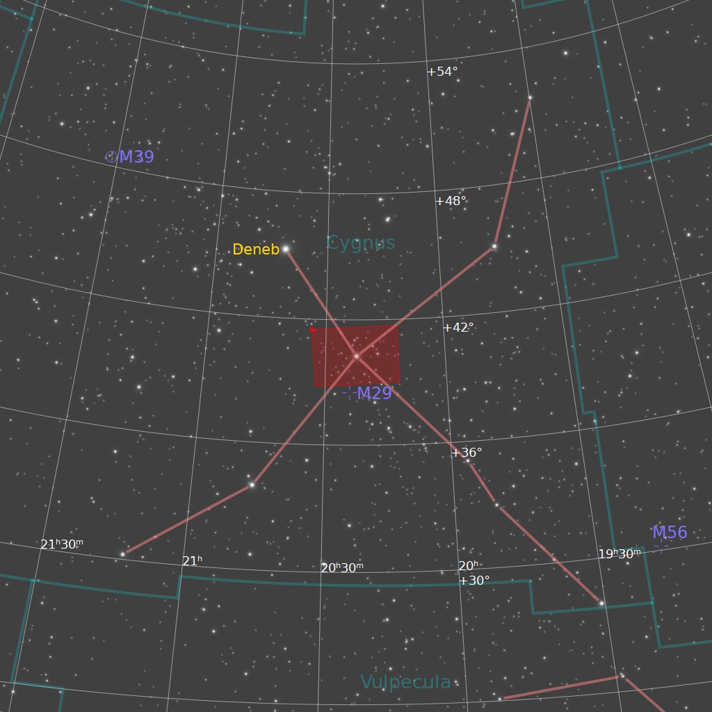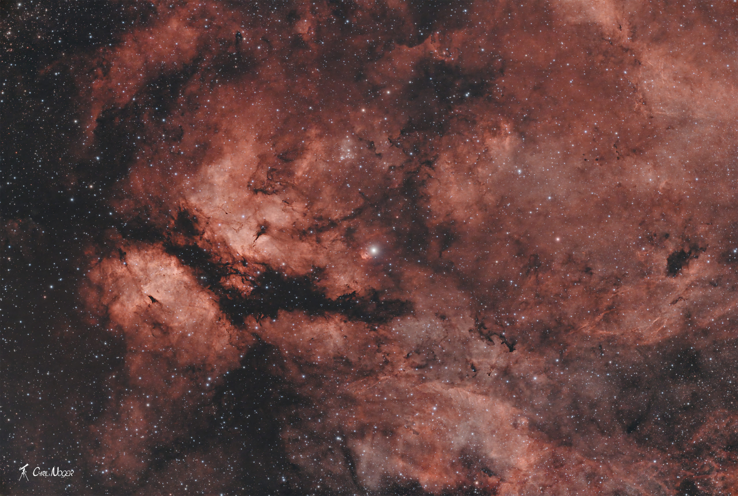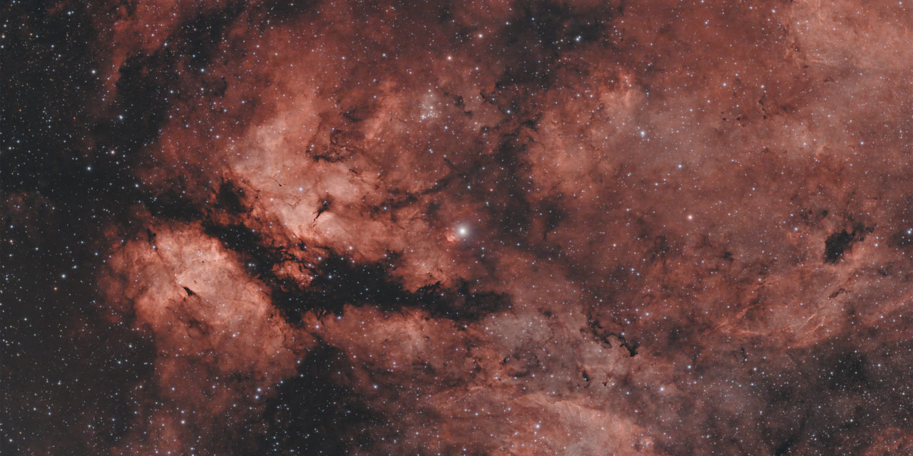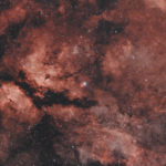 Voici le résultat de 2h de pose sur l’étoile Sadr dans la Constellation du Cygne avec son voisinage gorgé principalement d’hydrogène. A gauche de Sadr, on peut notamment voir la Nébuleuse du Papillon (IC1318).