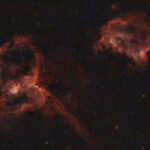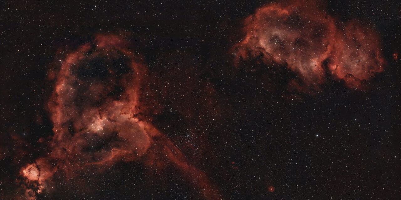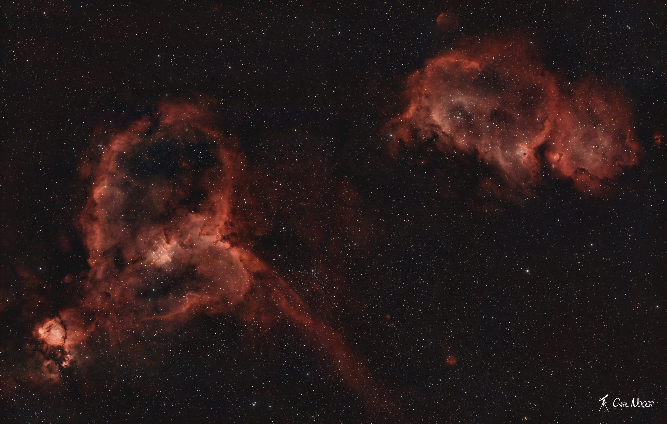 IC 1848 (à droite), également connue sous le nom de nébuleuse de l’Âme (Soul Nebula), est une nébuleuse en émission et un amas ouvert dans la constellation de Cassiopée. Elle est située à environ 7000 années-lumière de nous.
