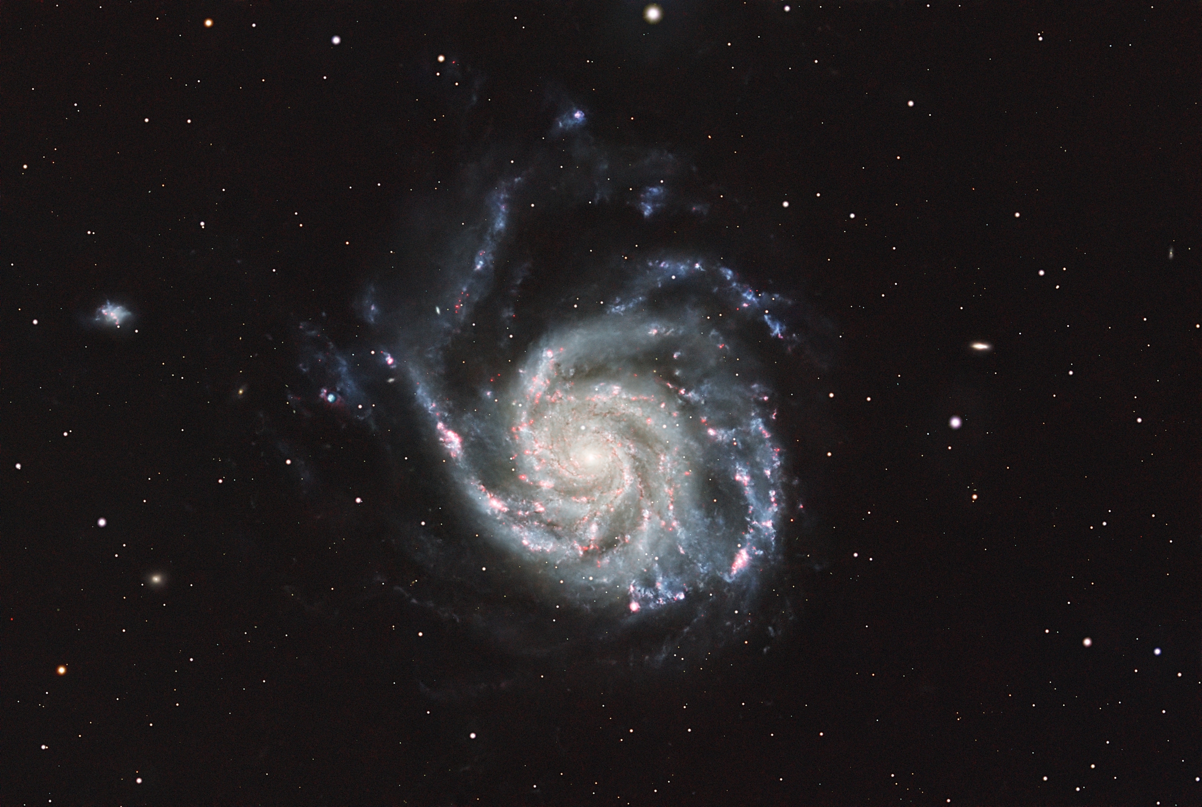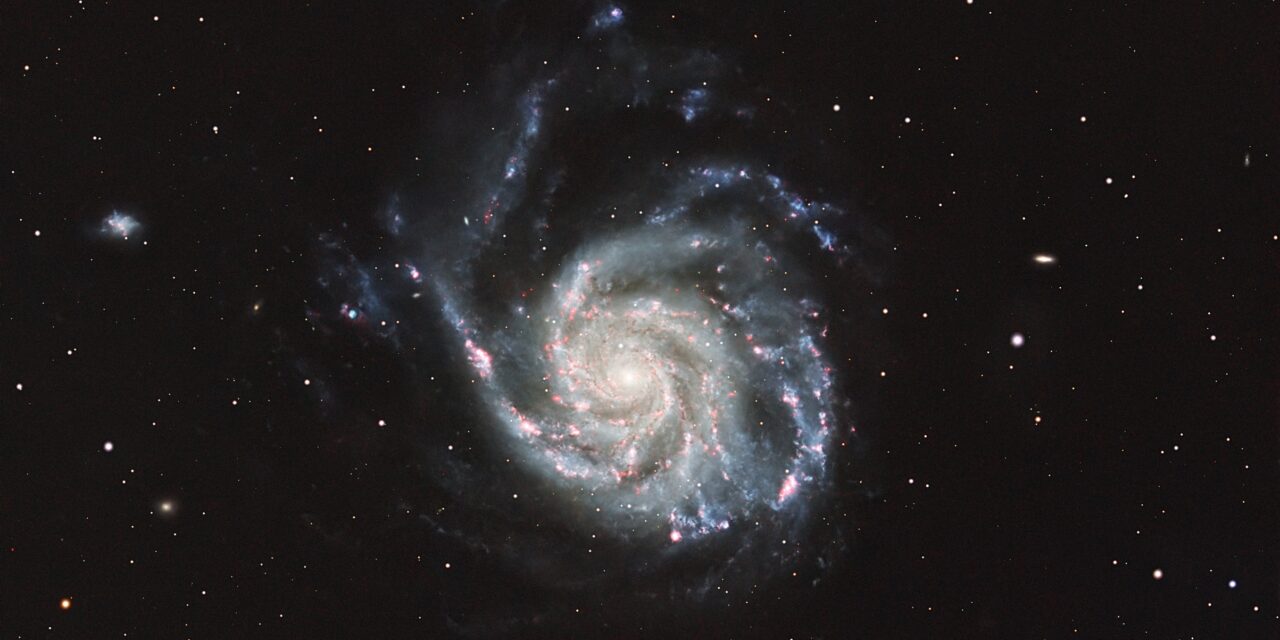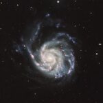 C’est une galaxie spirale de grande taille située à 23 millions d’années-lumière d’un diamètre de 170000 années-lumière soit à peu près 70% plus grande que notre galaxie. Nous avons la chance qu’elle soit visible de face. On distingue bien ses bras spiraux assez détachés qui lui ont valu son surnom de galaxie du Moulinet.