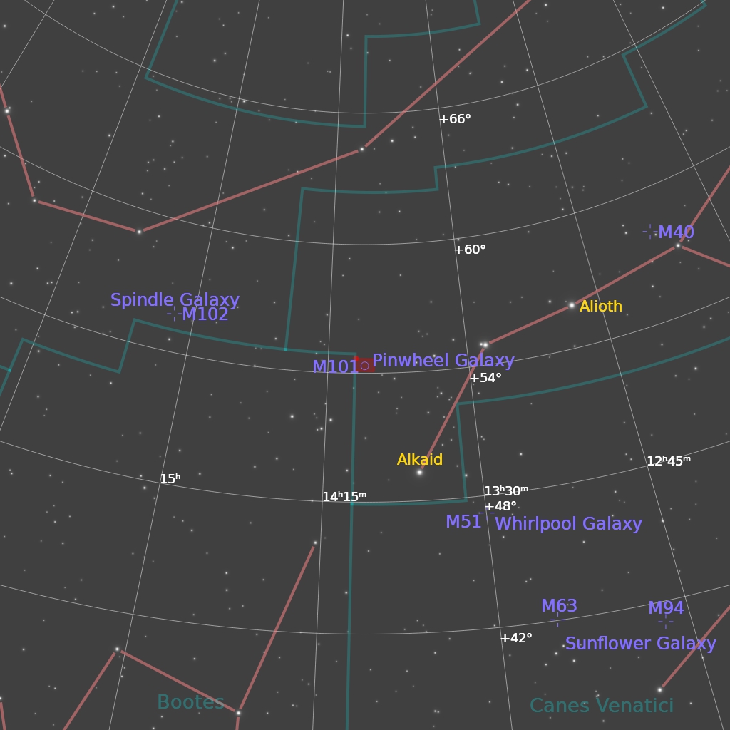 Située dans la constellation de la Grande Ourse, M 101 est une galaxie d’un diamètre apparent un peu moins grand que celui de la lune. Elle n’est malheureusement pas visible à l’œil nu, même si on peut la deviner aux jumelles.