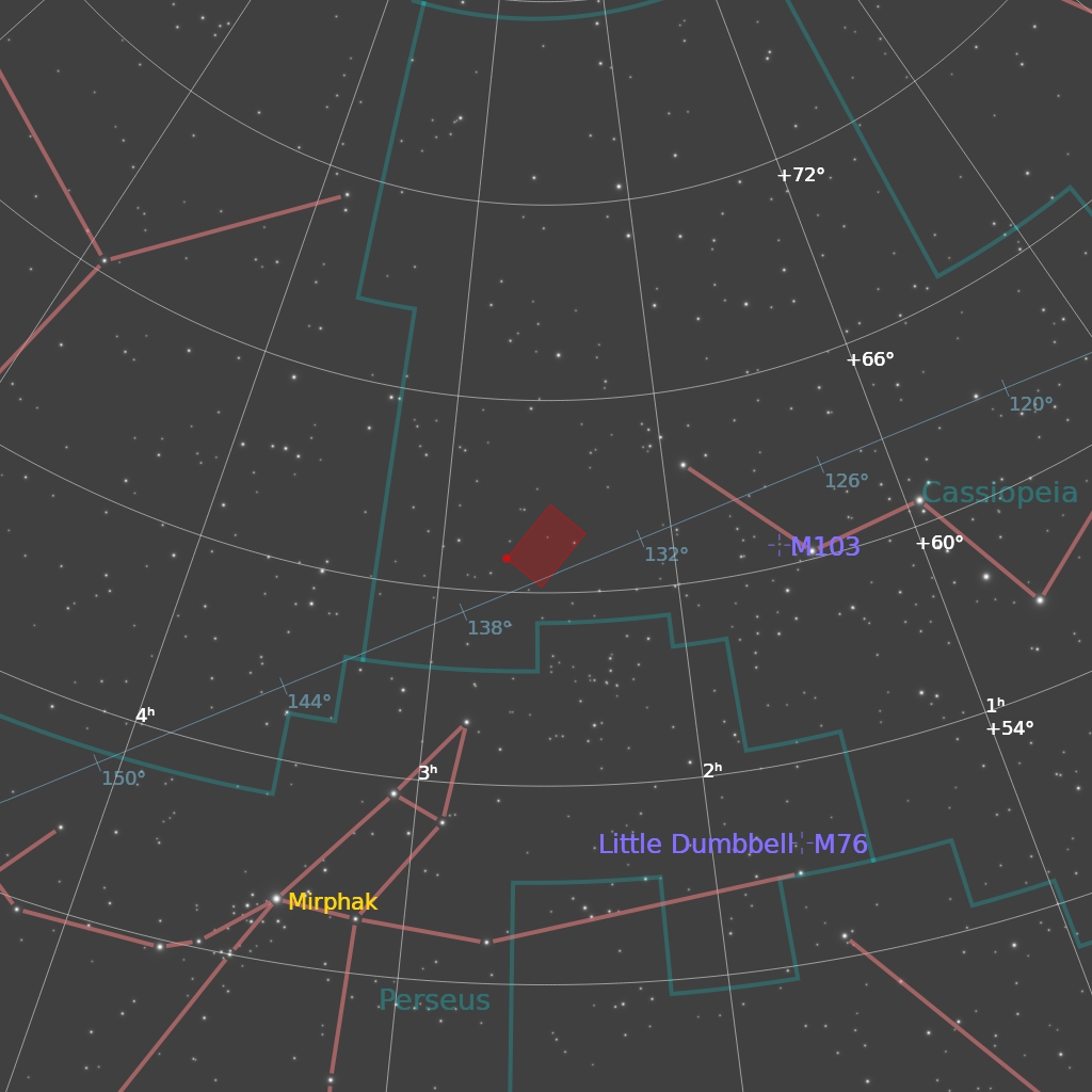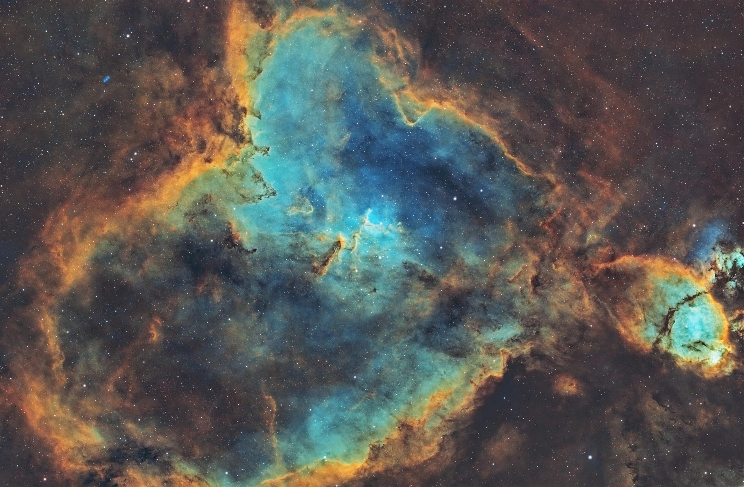 IC 1805 surnommée la nébuleuse du cœur est une nébuleuse en émission, c’est à dire un nuage de gaz ionisé qui émet sa propre lumière. Cette luminescence provient de l’ionisation du gaz par des étoiles jeunes et très chaude. Ici principalement l’amas d’étoiles Melotte 15 situé au centre de la photo constitué d’étoiles très jeunes (~1,5 millions d’années). La nébuleuse est située à environ 7500 années-lumière et s’étend sur environ 200 années lumières. Bien qu’elle soit invisible à l’œil nu, son diamètre apparent est d’environ 4 fois la taille de la lune.